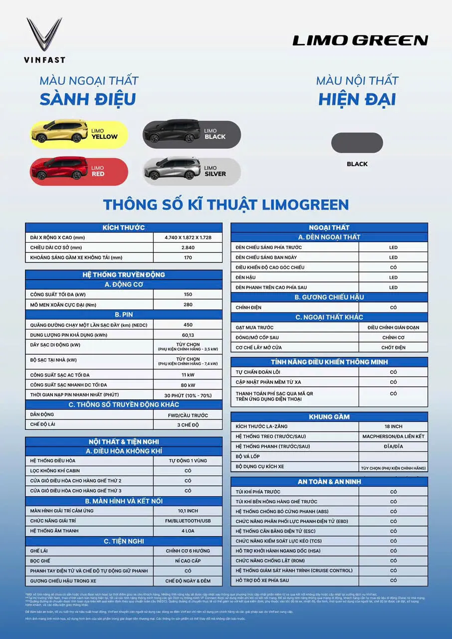 Limo Green được định vị tại phân khúc MPV đa dụng với kết cấu 7 chỗ ngồi. Xe sở hữu kích thước tổng thể dài x rộng x cao lần lượt là 4.740 x 1.872 x 1.728 (mm), chiều dài cơ sở 2.840 mm. Các thông số này lớn hơn đối thủ Mitsubishi Xpander, Toyota Veloz và ngang ngửa với những mẫu MPV tầm trung như GAC M6 Pro, Hyundai Custin, hứa hẹn mang đến một không gian cabin rộng rãi, sự thoải mái cho người ngồi ở hàng ghế sau và đảm bảo khoang chứa hành lý rộng.