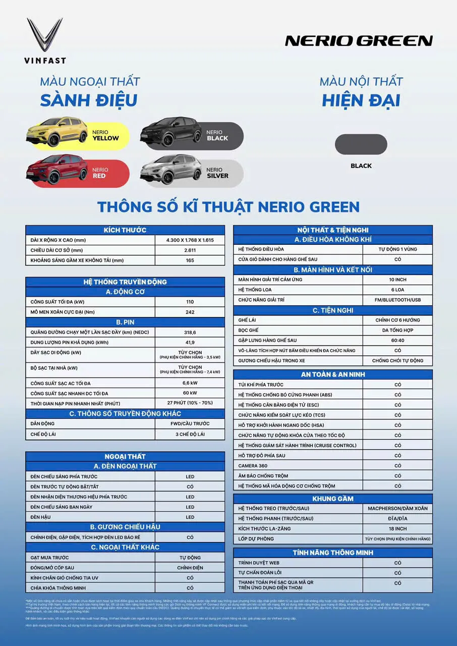 Cỗ máy điện trên Nerio Green giúp xe vận hành tối đa 318,6 km sau mỗi lần sạc đầy, thời gian sạc pin từ 10% lên 70% là 27 phút. Xe có 3 chế độ lái, gồm Eco, Comfort và Sport. Cùng với đó là gói an toàn nâng cao ADAS và Smart Services, gia tăng sự an tâm và tiện lợi cho người dùng.