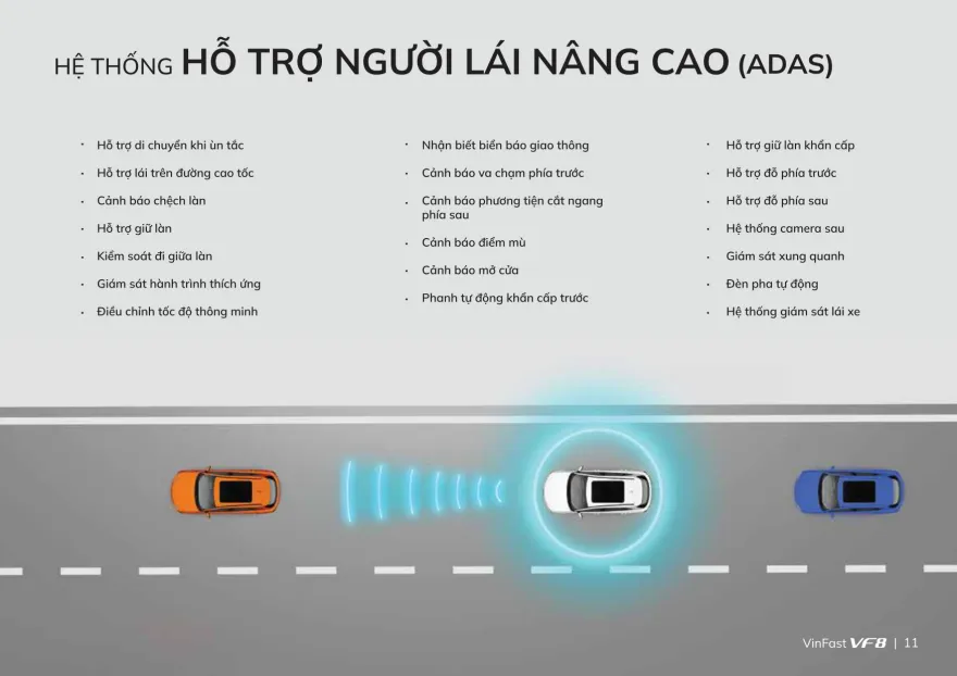ADAS - Công nghệ hỗ trợ lái xe thông minh, an toàn đã được VinFast trang bị trên các dòng xe xăng và xe điện VinFast VF e34, có thể kể đến các tính năng như: giám sát hành trình thích ứng, hệ thống giám sát xung quanh 360 độ, cảnh báo điểm mù,...